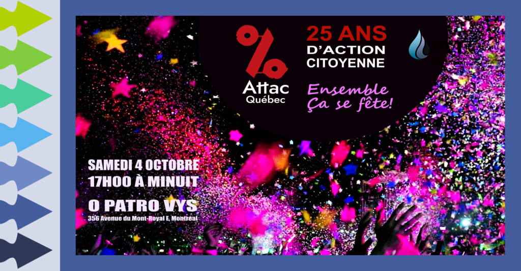 Les 25 ans d’Attac Québec : Célébration en humour et en musique de 25 ans d’engagement et d’actions citoyennes pour la justice fiscale, sociale et écologique.