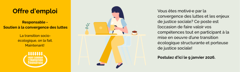 Le FCTÉ recrute une personne pour faciliter et soutenir la convergence des luttes au sein de sa coalition.